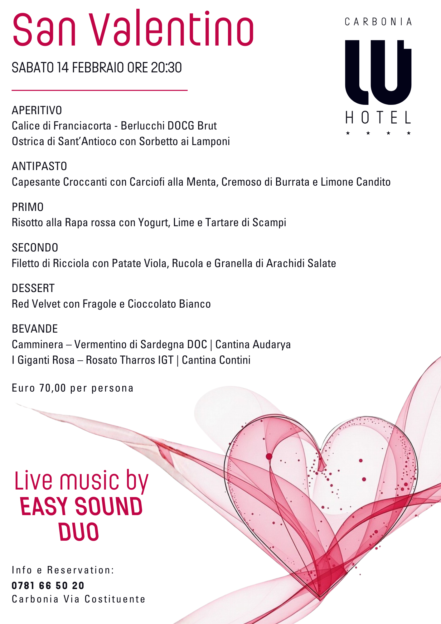• Una prelibata cena di San Valentino per due, servita al tavolo nella romantica atmosfera del Lu’ Restaurant. Bevande incluse. La serata sarà accompagnata dall'avvolgente musica del Easy Sound Duo